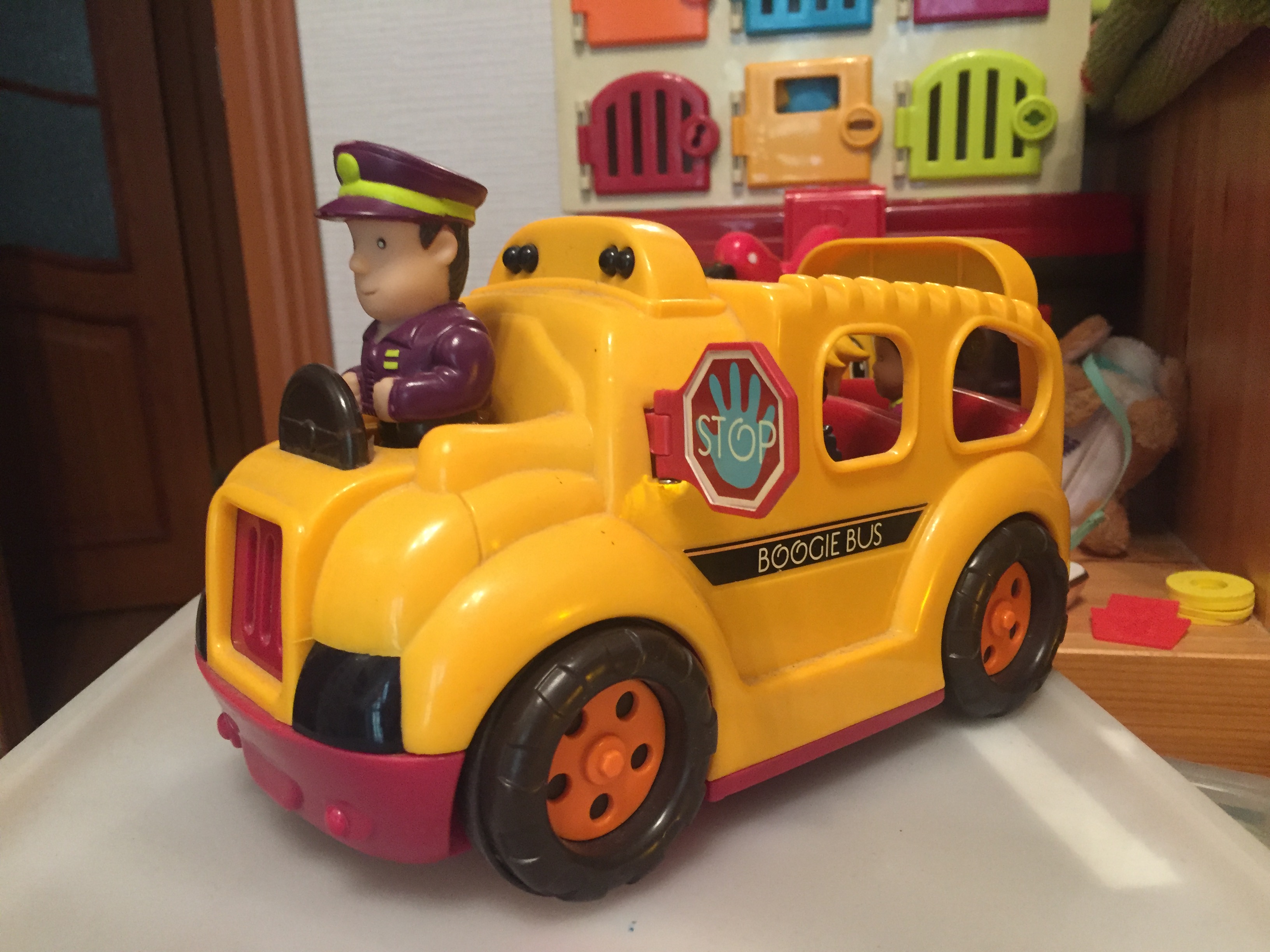 Школьный автобус с 4 пассажирами. Нажмите на Голову водителя, и автобус заведется и поедет. Натолкнувшись на препятствие, машинка остановится и поедет назад. Задняя дверь откидывается. Предусмотрено автоматическое выключение. Батарейки входят в комплект